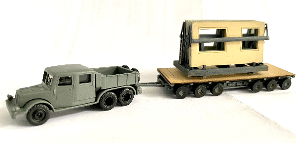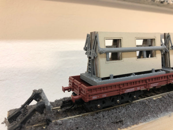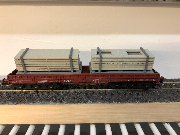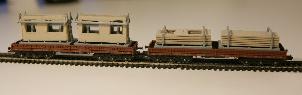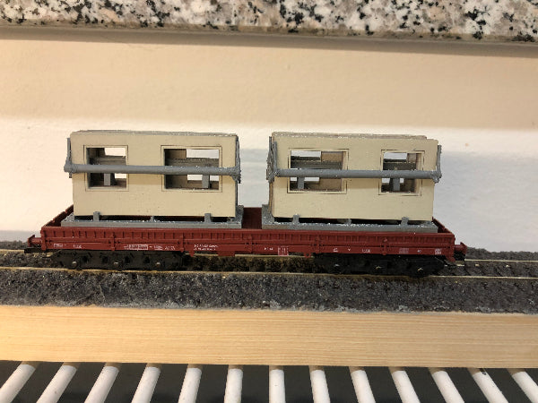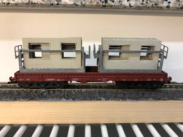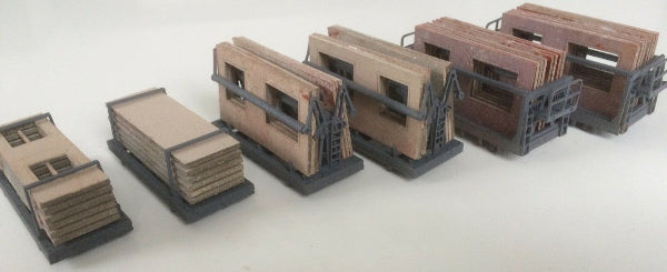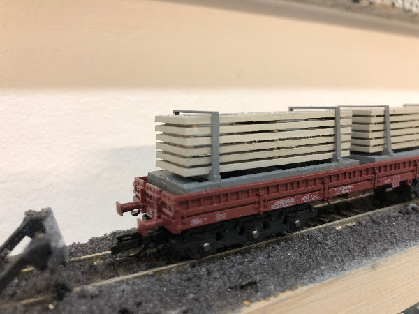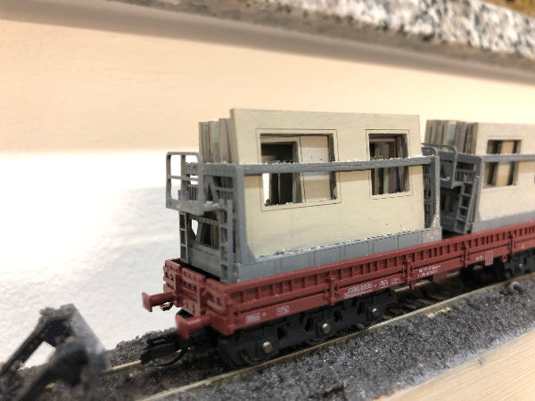Sehr filigrane Transportgestelle zur Verladung von Fassadenplatten für die Gebäude des Typs WBS 70 (Wohnungsbauserie 70) der DDR. Das Transportgestell eignet sich als Ladegut für Niederbordwagen mit Reichsbahnbeschriftung (Fa. Schirmer, gesondertes Angebot) sowie für Tiefladeanhänger (Fa. TAM, Töpelmann).