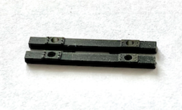 Im SLA-Druckverfahren hergestellte fein detaillierte Pufferbohle für Wagen der Nenngröße TT. Eingearbeitet sind die Pufferplatten mit jeweils sechs Nieten. Die Maße sind 26 x 3 x 2 mm mit einem 1,5 mm-Loch für die Puffer. Die Löcher können auch auf andere Durchmesser vorsichtig aufgebahrt werden. Ebenso sind die Bohlen leicht auf die passende Breite einzukürzen.